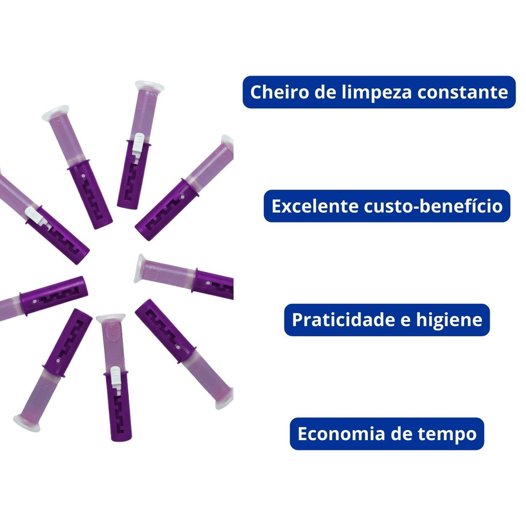 - Mantém o vaso sanitário limpo e perfumado automaticamente a cada descarga.