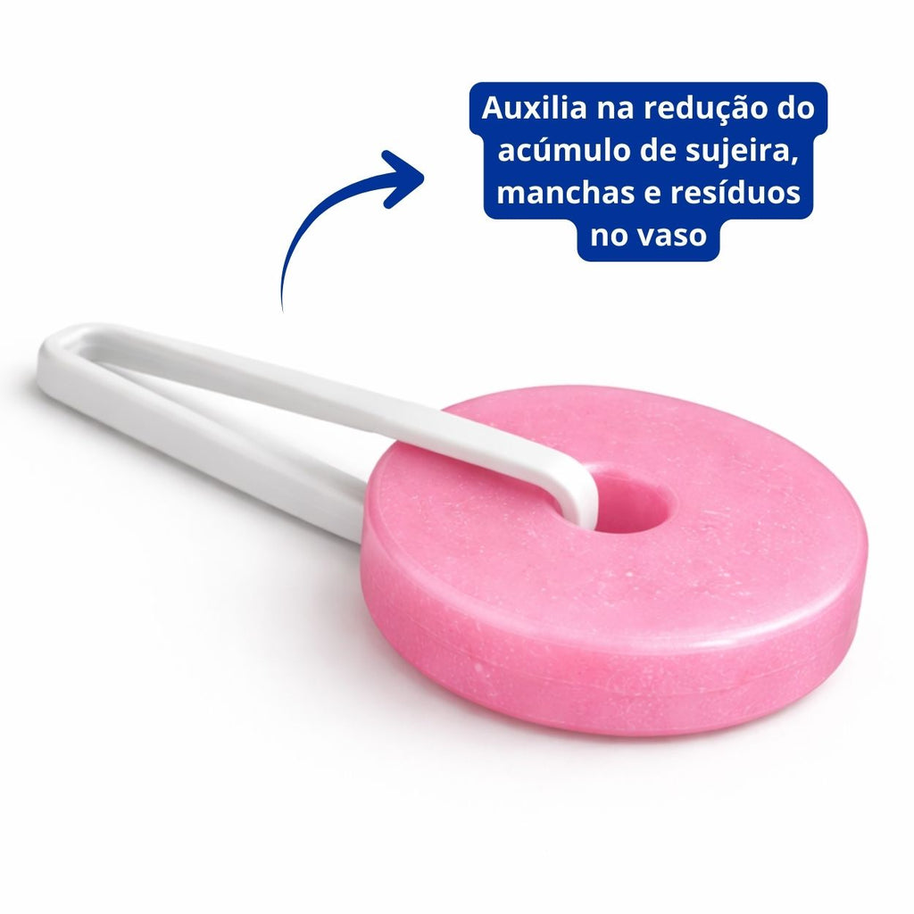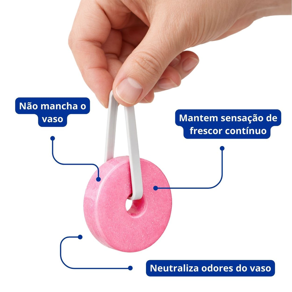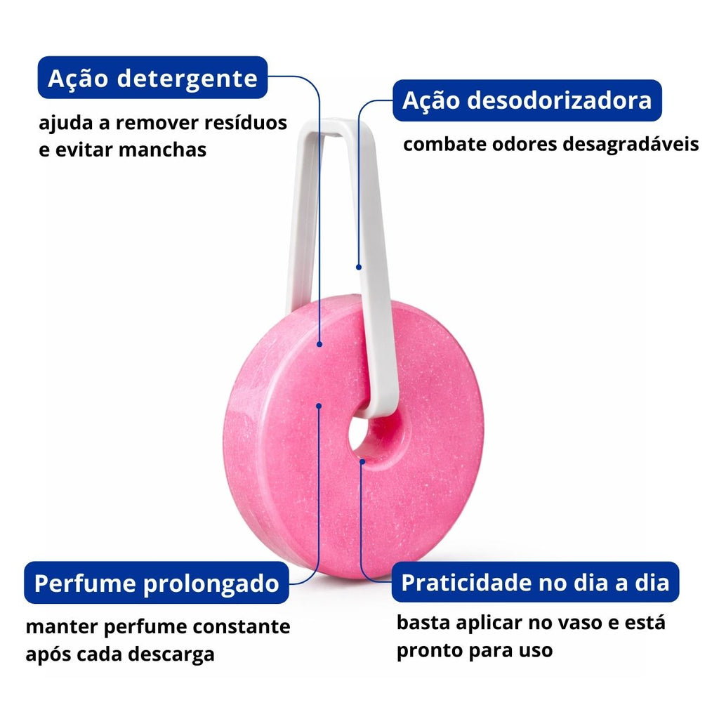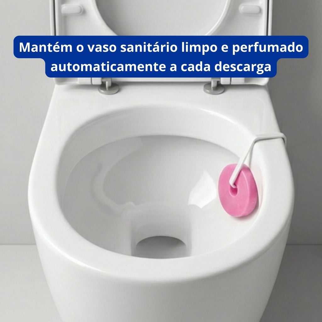 - Mantém o vaso sanitário limpo e perfumado automaticamente a cada descarga.